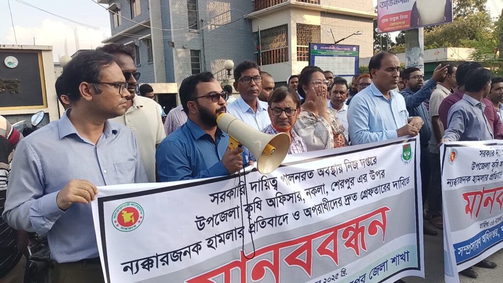 শেরপুরের নকলা উপজেলা কৃষিকর্মকর্তাকে মারধরের ঘটনায় কাইয়ুমকে দ্রুত গ্রেফতার ও বিচারের দাবিতে মানববন্ধন ও সংবাদ সম্মেলন