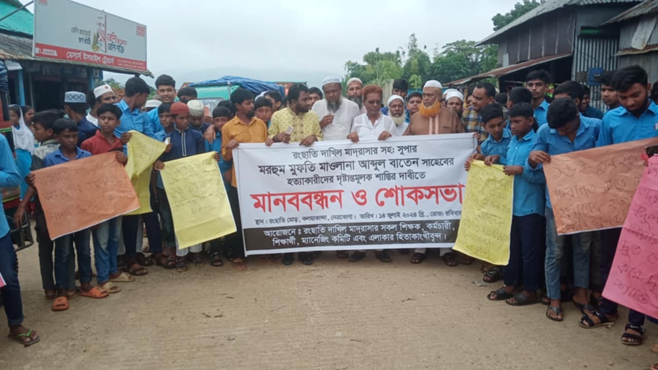 নেত্রকোনা প্রতিনিধি: নেত্রকোনার কলমাকান্দায় দুর্বৃত্তের ছুরিকাঘাতে মসজিদের ইমাম ও রংছাতি দাখিল মাদ্রাসার সহ-সুপার মাওলানা আব্দুল বাতেনকে (৬০) হত্যার বিচার দাবিতে মানববন্ধন ও বিক্ষোভ মিছিল হয়েছে।