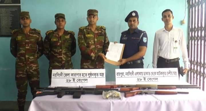 এসময় নরসিংদী ক্যাম্পের দায়িত্বে নিয়োজিত ২৮ইষ্ট বেঙ্গল সেনাবাহিনীর লেফটেন্যান্ট কর্ণেল মোহাম্মদ ফাহিম মাহবুব জানান, গতকাল জেলার চিনিশপুর গ্রামে অভিযান চালিয়ে জেলা কারাগার থেকে লুট হওয়া একটি শটগান ও একটি রাইফেল উদ্ধার করা হয়।