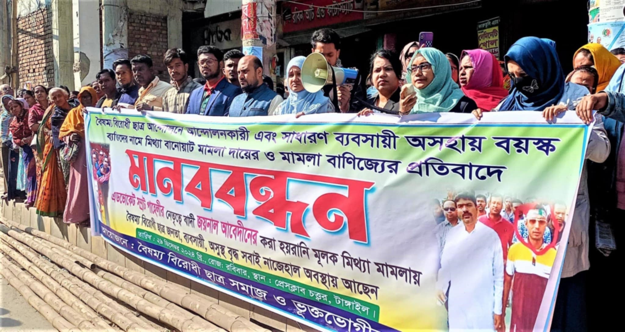 জহুরুল ইসলাম, স্টাফ রিপোর্টার: টাঙ্গাইলে বৈষম্য বিরোধী ছাত্র আন্দোলনকারী, সাধারণ ব্যবসায়ী ও অসহায় বয়স্ক ব্যক্তিদের নামে মিথ্যা অভিযোগে মামলা দায়ের করে অর্থবাণিজ্যর প্রতিবাদে মানববন্ধন কর্মসূচি পালন করা হয়েছে। রবিবার (২৯ ডিসম্বর) টাঙ্গাইল প্রেসক্লাবের সামনে বৈষম্য বিরোধী ছাত্র সমাজ ও ভুক্তভোগী পরিবারের ব্যনারে ঘণ্টাব্যাপী ওই মানববন্ধন কর্মসূচি পালন করা হয়। মানববন্ধন চলাকাল অন্যদের মধ্যে বক্তব্য রাখেন, অ্যাডভোকেট শামিমা নাজনিন সিথী, করটিয়া এইচএম ইনস্টিটিউট স্কুল অ্যান্ড কলেজের প্রভাষক চন্দন কুমার, ফাজিলহাটি ইউনিয়ন বিএনপির সাবেক সাধারণ সম্পাদক মো. শাজাহান মিয়া প্রমুখ।