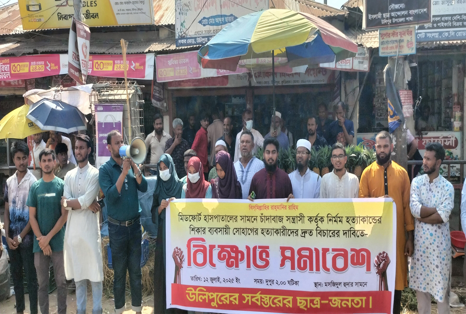 খালেক পারভেজ লালু উলিপুর (কুড়িগ্রাম): কুড়িগ্রামের উলিপুরে মিটফোর্ডে নির্মমভাবে ব্যবসায়ীকে হত্যার প্রতিবাদ ও অপরাধীদের দ্রত দৃষ্টান্তমূলক শাস্তির দাবিতে বিক্ষোভ ও মানববন্ধন অনুষ্ঠিত হয়েছে। শনিবার ১২ জুলাই দুপুরে উলিপুর মসজিদুল হুদা মোড়ে ছাত্র-জনতার ব্যানারে এ মানববন্ধন অনুষ্ঠিত হয়।