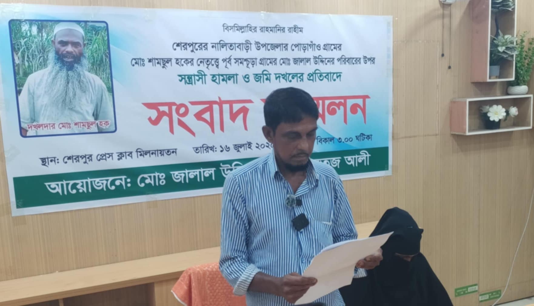 শেরপুরে সন্ত্রাসী হামলা ও জমি দখলের প্রতিবাদে সংবাদ সম্মেলন
