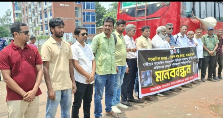 সাংবাদিক হত্যার প্রতিবাদ ও সাংবাদিকদের পেশাগত রাষ্ট্রীয় নিরাপত্তা নিশ্চিতের দাবিতে নওগাঁয় মানববন্ধন