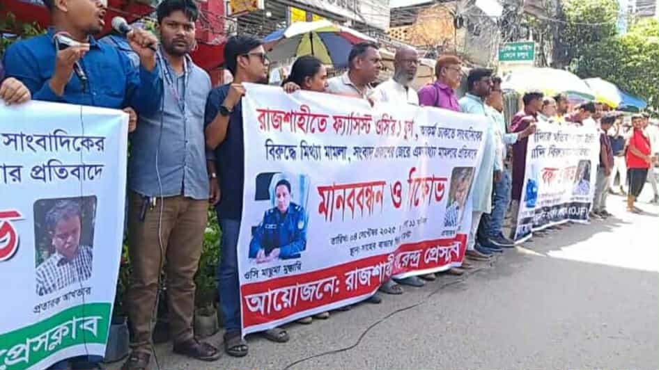 অন্যথায়  শীঘ্রই কঠোর আন্দোলনের হুঁশিয়ারি দেন সাংবাদিক নেতারা। ঘটনা প্রবাহ:- গত ২৬ আগস্ট রাজশাহী নগরীর অগ্রণী ব্যাংক আরডিএ শাখায় জমি নিলামকে কেন্দ্র করে এক ঘটনায় সাংবাদিকরা তথ্য সংগ্রহ করতে গেলে স্থানীয় একটি পত্রিকার, কথিত পত্রিকার মালিক পরিচয়দানকারী প্রতারক (ঠিকাদার)আক্তারুল ইসলামের সঙ্গে:সাংবাদিকদের তাদের বাকবিতণ্ডা হয়। এ সময় আক্তার একজন সাংবাদিকের মোবাইল ছিনিয়ে আছড়ে ভেঙে ফেলেন এবং অশালীন ভাষায় গালিগালাজ করেন। ঘটনাটি ভিডিওতে ধারণ হয়ে সামাজিক যোগাযোগমাধ্যমে ছড়িয়ে পড়লে ব্যাপক সমালোচনা হয়। পরে সাংবাদিকরা সংশ্লিষ্ঠ থানায় প্রতারক আক্তারের বিরুদ্ধে মামলা করতে চাইলে ওসি মাছুমা মুস্তারী মামলা না নিয়ে কেবল লিখিত অভিযোগ নেন।