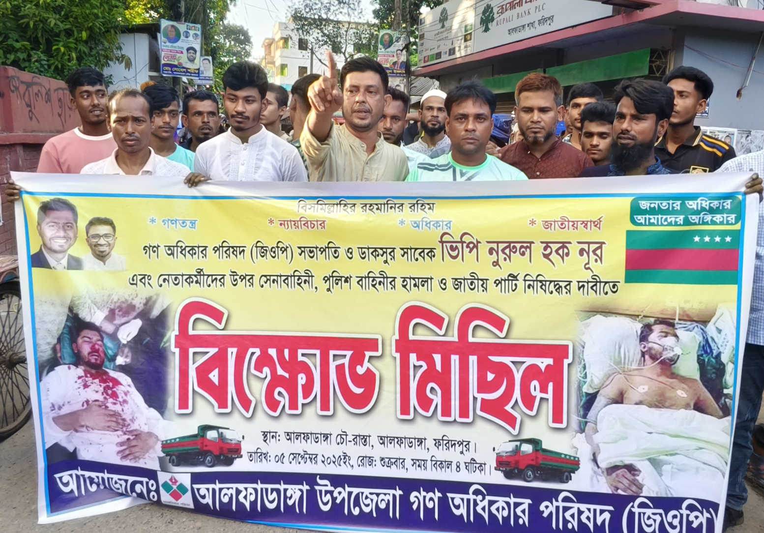 আলফাডাঙ্গায় ভিপি নূরের উপর হামলার প্রতিবাদে ও জাতীয় পার্টি নিষিদ্ধের দাবিতে গণ অধিকার পরিষদের বিক্ষোভ মিছিল