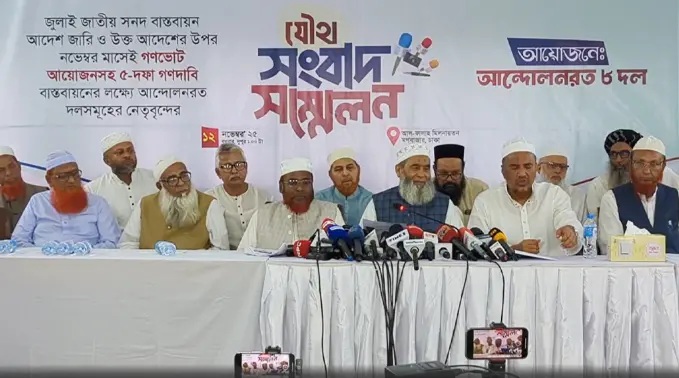 সংবাদ সম্মেলনে বলা হয়েছে, আগামীকাল শুক্রবার ৫ দফা দাবিতে সারাদেশে জেলা ও মহানগর পর্যায়ে বিক্ষোভ মিছিল অনুষ্ঠিত হবে। আর আগামী রোববার (১৬ নভেম্বর) সকাল ১১টায় ৮ দলের শীর্ষ নেতাদের বৈঠক অনুষ্ঠিত হবে। বৈঠক শেষে দুপুরে সংবাদ সম্মেলন অনুষ্ঠিত হবে। এর আগেই দাবি মেনে নেয়া না হলে সংবাদ সম্মেলন থেকে প্রধান উপদেষ্টার কার্যালয় যমুনার সামনে অনির্দিষ্টকালের জন্য অবস্থানের কর্মসূচি ঘোষণা করা হবে।
