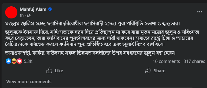 তিনি আরও লিখেছেন, জুলুমকে ইনসাফ দিয়ে, সহিংসতাকে দরদ দিয়ে প্রতিস্থাপন না করে, যারা নতুন মাত্রার জুলুম ও সহিংসতা করে বেড়াচ্ছেন, তারা ফ্যাসিবাদের পুনর্জাগরণের জন্য দায়ী থাকবেন। সমাজে রাষ্ট্রে চিন্তা ও আচারের বৈচিত্র্যকে বাধাগ্রস্ত করলে ফ্যাসিবাদ পুনঃপ্রতিষ্ঠিত হবে এবং জুলাই বিপ্লব ব্যর্থ হবে।