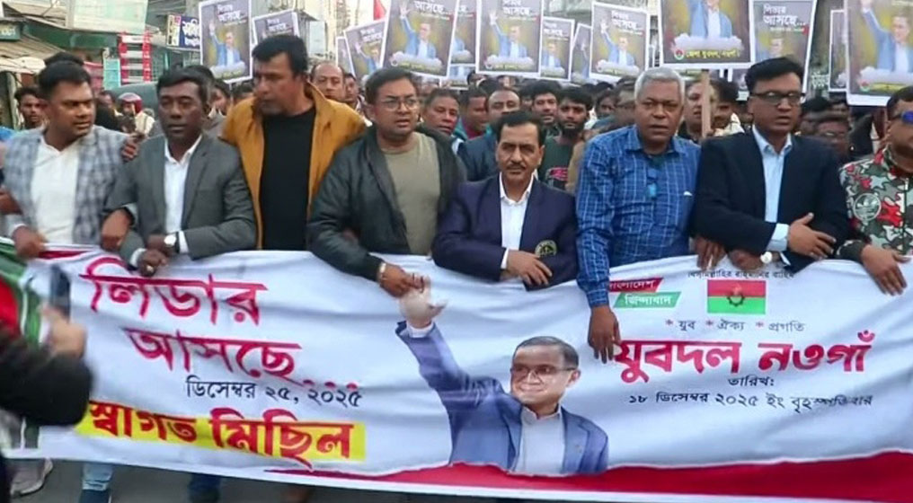 তারেক রহমানের স্বদেশ প্রত্যাবর্তন উপলক্ষ্যে নওগাঁয় স্বাগত মিছিল
