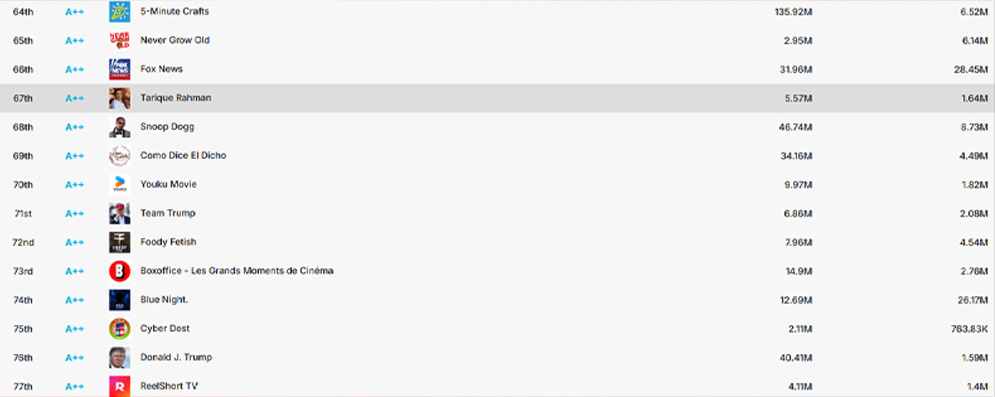 সামাজিকমাধ্যম বিশ্লেষণধর্মী ওয়েবসাইট সোশ্যাল ব্লেড প্রকাশিত ‘টপ ১০০ ফেসবুক ক্রিয়েটরস বাই সোশ্যাল’ তালিকায় তারেক রহমানের অবস্থান এখন ৬৭তম।