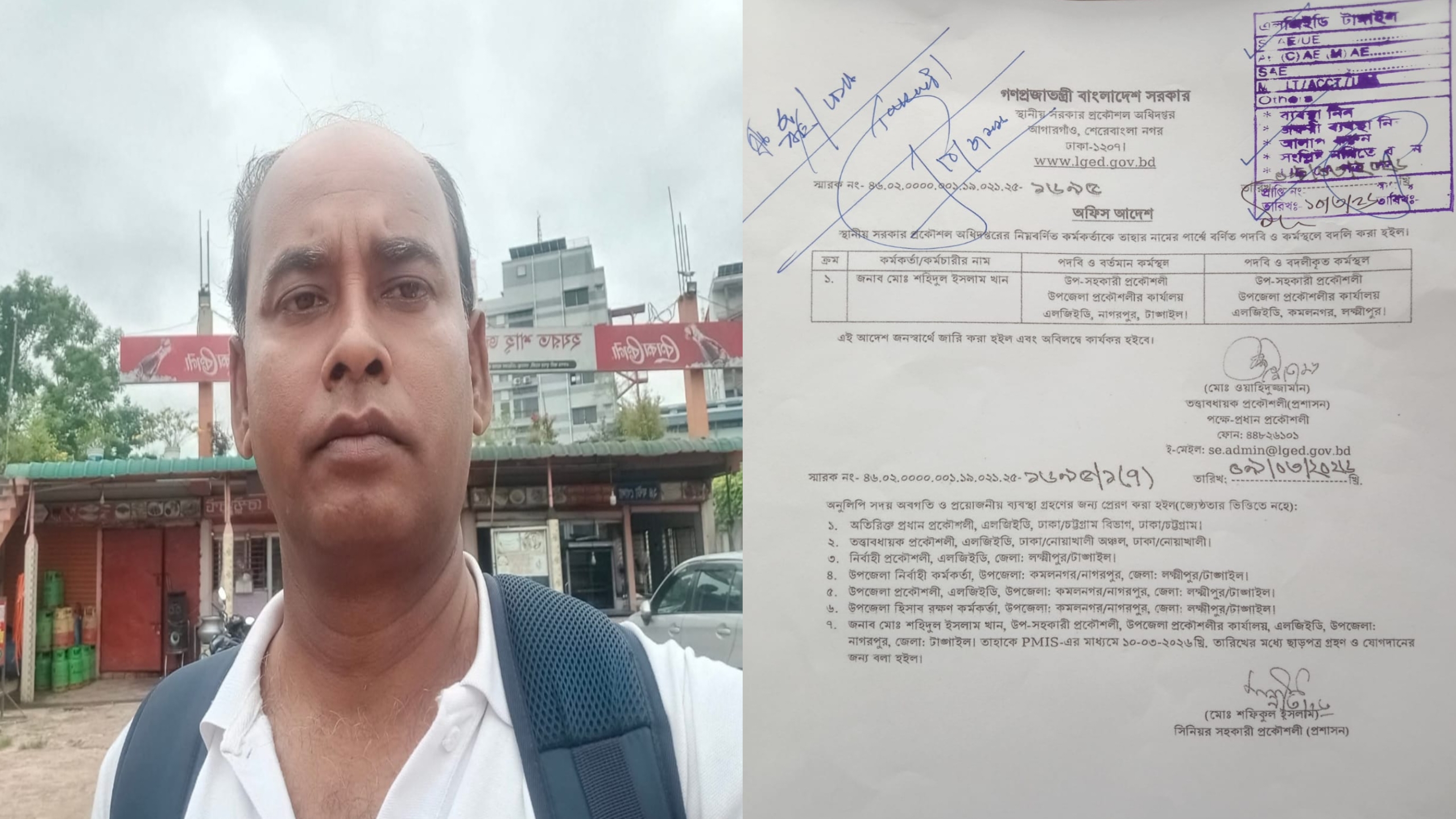 এলজিইডির তত্ত্বাবধায়ক প্রকৌশলী (প্রশাসন) মো. ওয়াহিদুজ্জামান স্বাক্ষরিত অফিস আদেশ (স্মারক নং–১৬৯৬) অনুযায়ী, তাকে অবিলম্বে বর্তমান কর্মস্থল থেকে ছাড়পত্র গ্রহণ করে ১০ মার্চের মধ্যে নতুন কর্মস্থলে যোগদানের নির্দেশ দেওয়া হয়েছে।