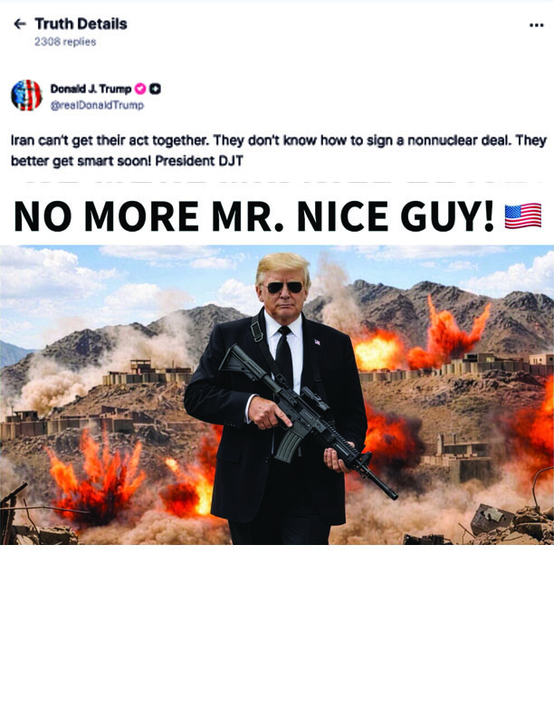 বুধবার ( ২৯ এপ্রিল ) ট্রাম্প নিজ সামাজিক যোগাযোগমাধ্যম প্ল্যাটফর্ম ‘ট্রুথ সোশ্যাল’-এ একটি ছবি শেয়ার করেন। যেখানে তাঁর পেছনে ভয়াবহ বিস্ফোরণের দৃশ্য দেখা যাচ্ছে এবং ছবির ওপর বড় অক্ষরে লেখা ‘ভদ্র সাজার দিন শেষ’।