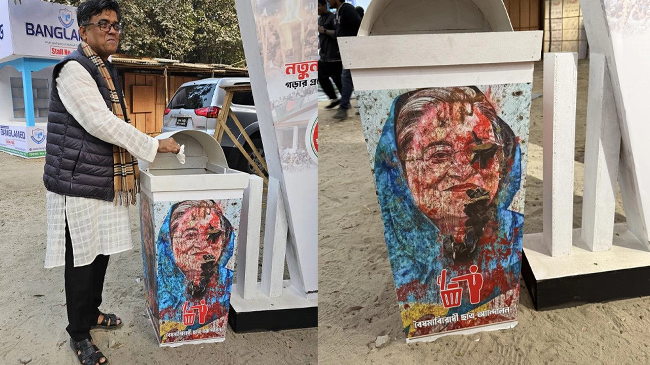 শেখ হাসিনার ছবিযুক্ত ডাস্টবিনে ময়লা ফেললেন প্রেস সচিব
