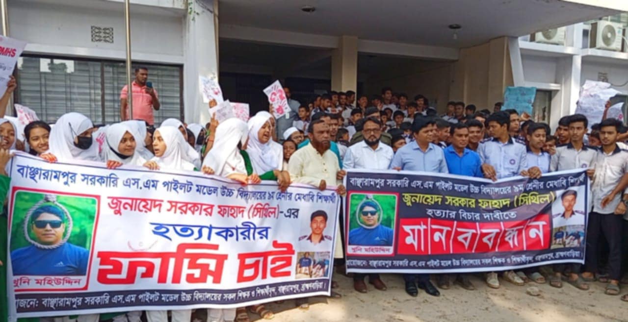 বাঞ্ছারামপুর নবম শ্রেণির শিক্ষার্থী হত্যাকারীদের গ্রেপ্তারের দাবিতে মানববন্ধন