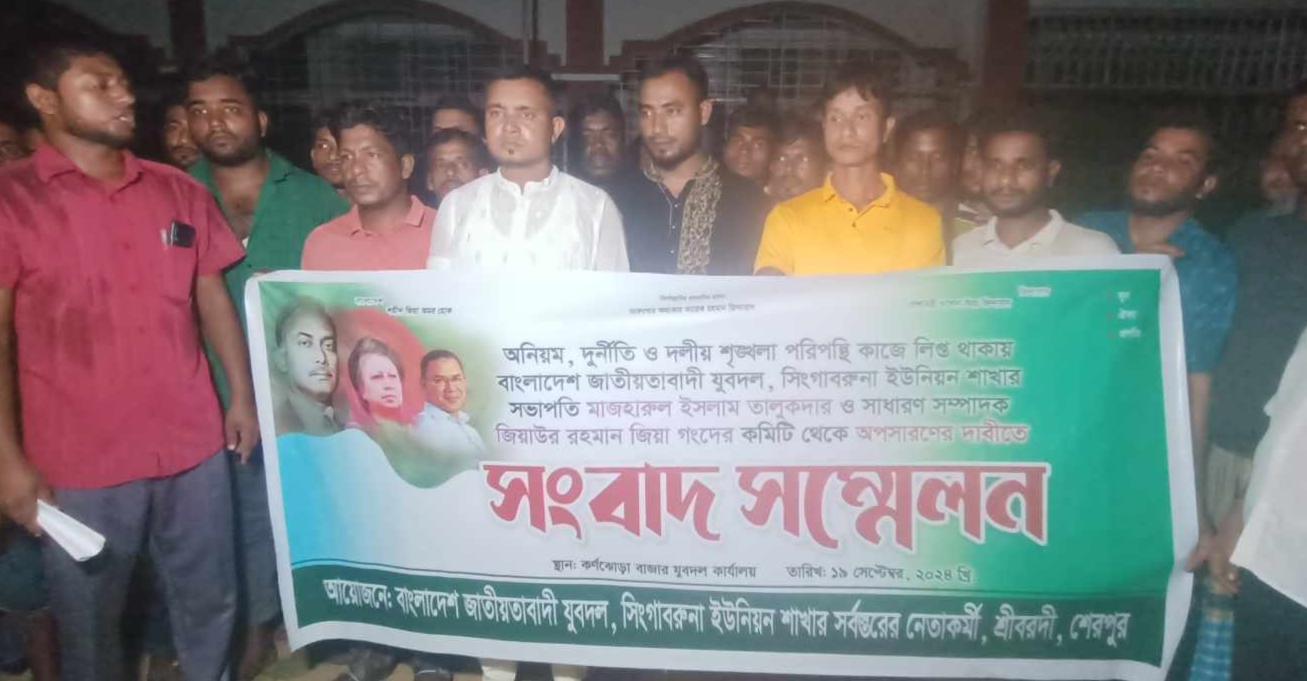 শেরপুরের শ্রীবরদীতে ইউনিয়ন যুবদলের সভাপতি ও সম্পাদককে অপসারণের দাবিতে সংবাদ সম্মেলন