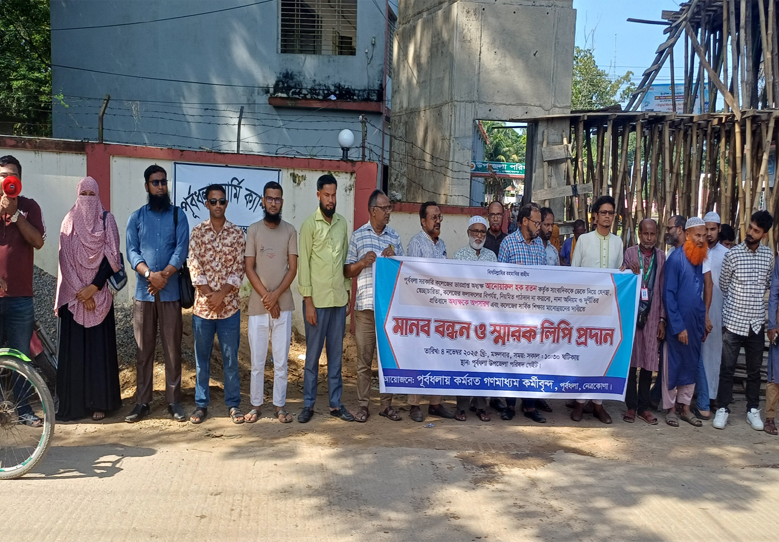 সাংবাদিককে হুমকির প্রতিবাদে অধ্যক্ষকে অপসরণের দাবিতে পূর্বধলায় মানববন্ধন ও স্মারকলিপি প্রদান