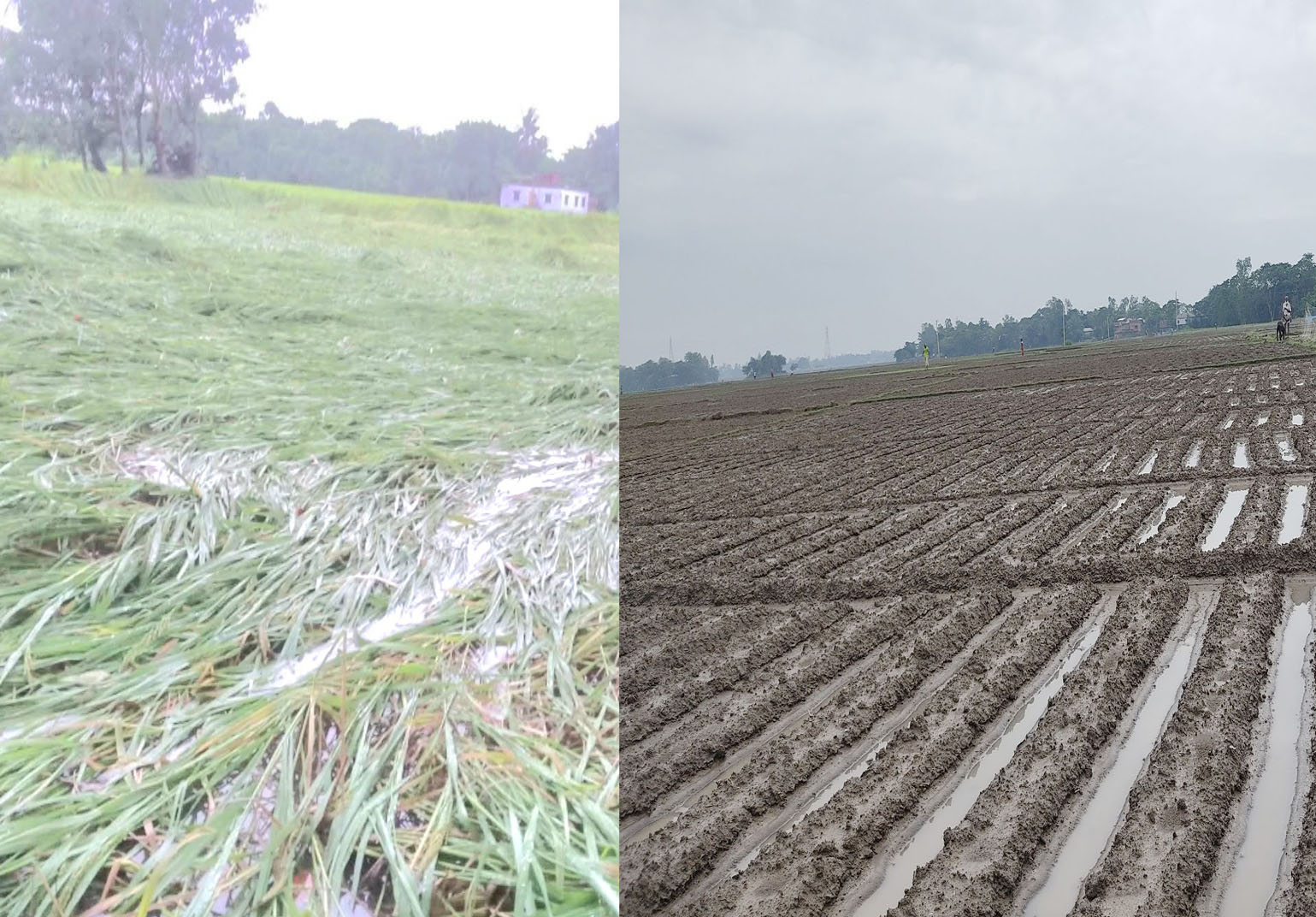 তাড়াশে ঝড়ো হাওয়ায় মাটিতে লুটিয়ে পড়েছে আমন ধান — চোখের সামনে ফসল হারাচ্ছেন কৃষকরা