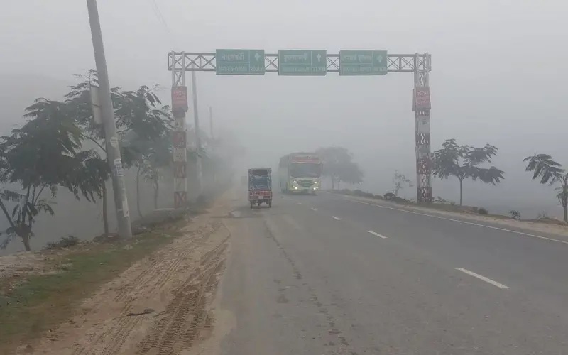 কুড়িগ্রামে বৃষ্টির মতো ঝরছে কুয়াশা, দিনে হেডলাইট জ্বালিয়ে চলছে যানবাহন