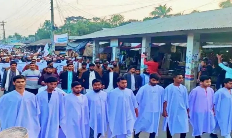 ভোলায় কাফনের কাপড় পরে দাঁড়িপাল্লার পক্ষে মিছিল