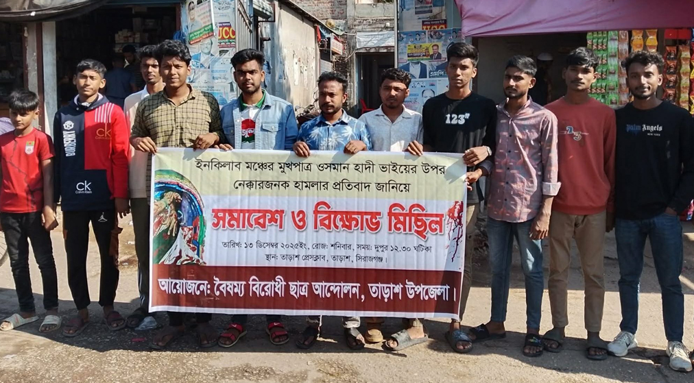 ওসমান হাদীর ওপর হামলার প্রতিবাদে তাড়াশে বিক্ষোভ মিছিল ও প্রতিবাদ সমাবেশ