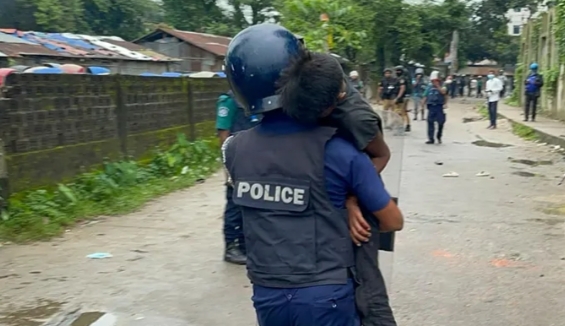আহত শিশুকে বুকে জড়িয়ে হাসপাতালে নিল পুলিশ