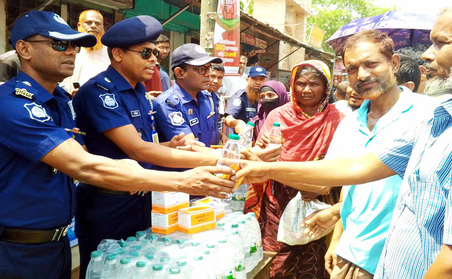 উলিপুরে তৃষ্ণার্ত পথচারীদের পুলিশের পানি-স্যালাইন বিতরণ